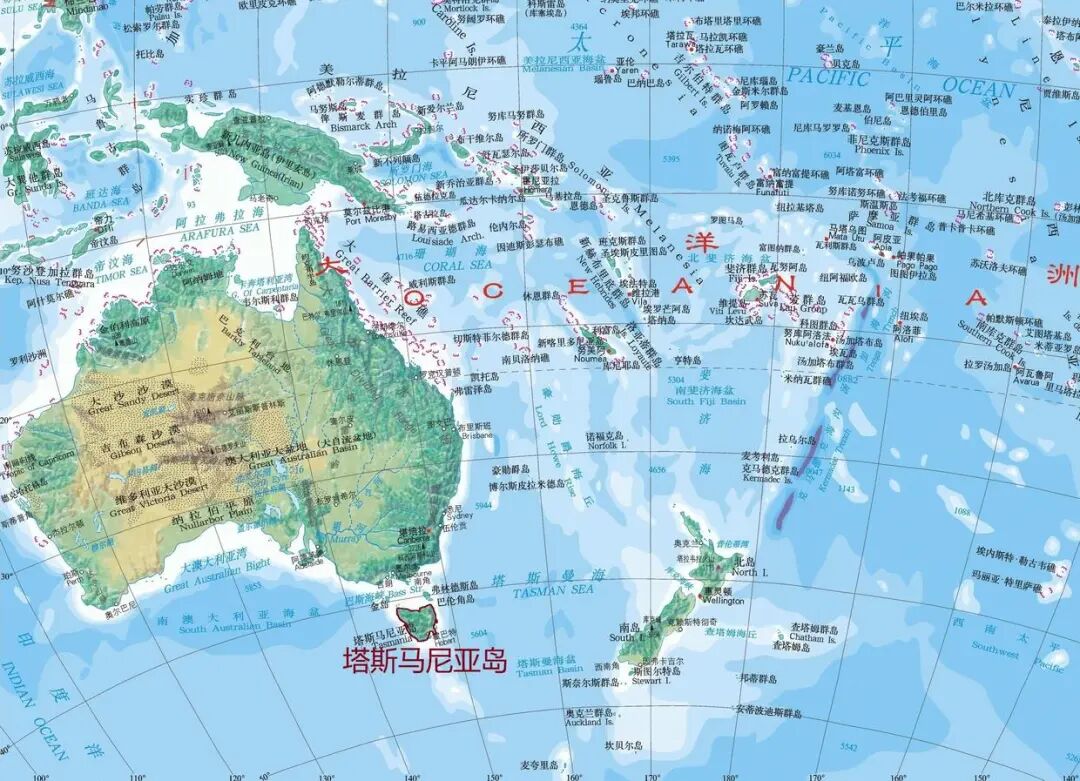 澳大利亚是大洋洲面积最大的国家,总面积约为769万平方千米,是世界第六大国。澳大利亚的领土主要有两部分组成,分别是世界上面积最小的大陆“澳大利亚大陆”和塔斯马尼亚岛。塔斯马尼亚岛位于澳大利亚大陆的东南部,东临太平洋,西临印度洋,往南隔海与南极洲相望,往北距离澳大利亚大陆大约240千米,中间隔着东西走向的巴斯海峡,海峡中的海水平均深度约为50米。