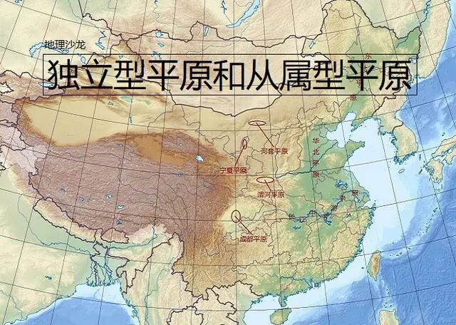 高原和大型山脉可以包含或者构成盆地地形,比如我国的青藏高原中就包含柴达木盆地,而塔里木盆地、准噶尔盆地和四川盆地,都是由高大山脉围成的,而这些盆地地形单元的内部,通常地形平坦,从而形成“从属型平原”。比如,我国的四川盆地内部就有“成都平原”,成都平原的总面积约为1.88万平方千米,呈四边形形态,是四川盆地的组成部分。此外,在河流穿越的许多地形区,由于流水的沉积作用,经常会形成大小不一的河流沿岸平原,这类平原也通常是“从属型平原”。比如黄河的重要支流渭河,在秦岭和黄土高原之间形成了呈东西走向的“渭河平原”。