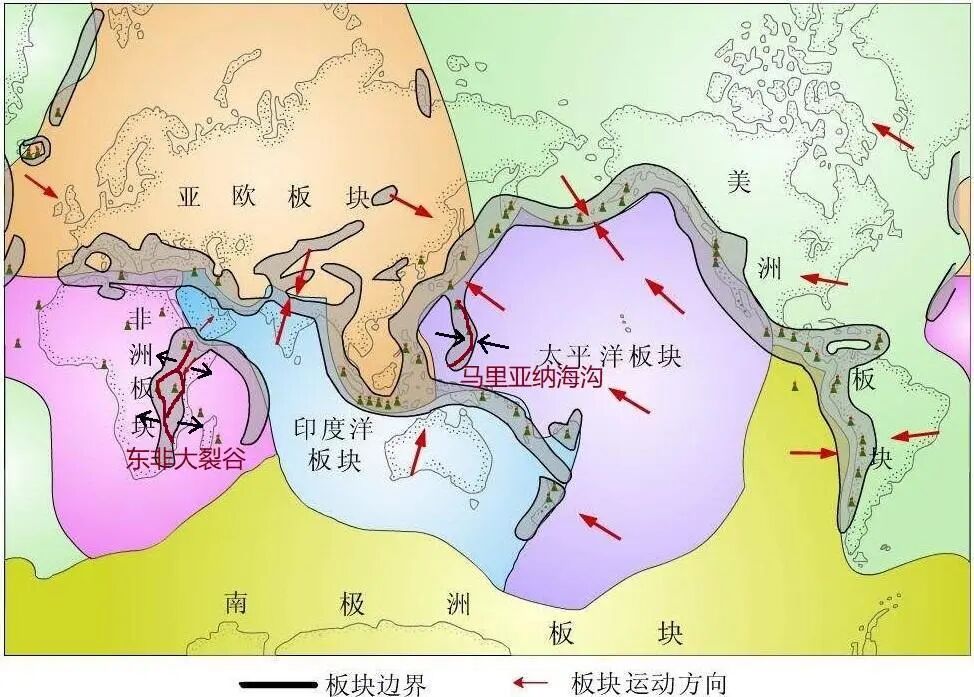 东非大裂谷和马里亚纳海沟都是由于地球地壳运动而形成的巨大宏观地形,两者都是由于板块运动而形成的地形形态,从这个角度来看它们的成因是相同的。不过,具体来说它们又是由于地处板块运动的不同边界而形成的,所以成因是不同的。东非大裂谷位于非洲大陆东部,北端与红海相连接,最北可达死海,往南纵贯埃塞俄比亚高原和东非高原,一直延伸到非洲南部的赞比西河河口附近,全长约5800千米,是世界陆地上最长的裂谷带。东非大裂谷的形成是由于非洲板块内部的张裂而形成,裂谷两侧板块往东西方向分离运动,从而使得板块张裂,断裂陷落形成巨大的裂谷带。