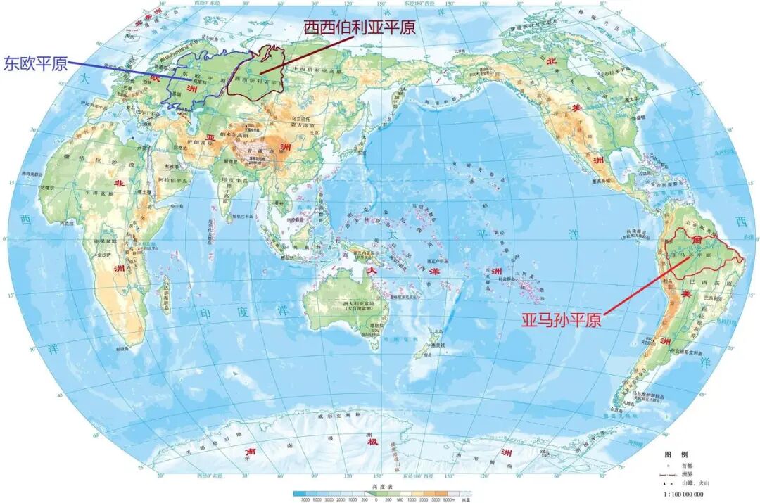 东欧平原是世界上面积第二大的平原,总面积约为400万平方千米;西西伯利亚平原是世界上面积第三大的平原,总面积约为260万平方千米,这两个平原基本上位于世界上面积最大的国家俄罗斯境内。我们在世界地图上来看,发现似乎东欧平原的面积比亚马孙平原的面积要大,为什么世界上面积最大的平原是亚马孙平原呢?我们知道,实际上亚马孙平原比东欧平原的面积要大差不多160万平方千米,怎么会图上看起来显得反而小呢?