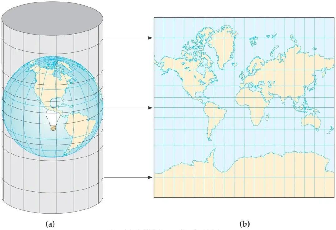 高纬度地区变形较大的“圆柱投影”方式