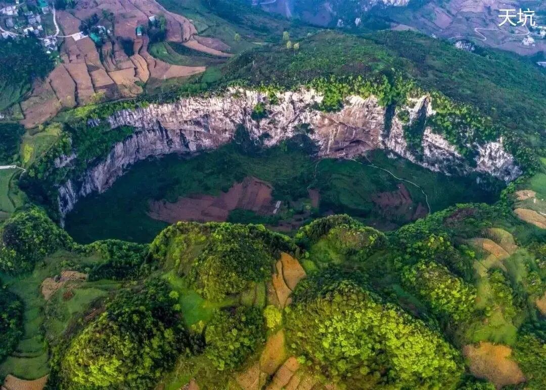 随着时间的推移,地下溶洞和暗河的规模不断扩大,有的暗河长度甚至可以长达几十或者上百千米,形成巨大的地下暗河网络。在喀斯特地貌发育的后期,随着流水在地下岩层中不断的进行溶蚀,使得地下溶洞的空间越来越大,最终无法承受上方的岩层重量而发生坍塌,在地表保留部分形态,形成天坑、天生桥、 坡立谷、峰林等景观。所以,“天坑”是喀斯特地貌发育到后期的产物,比如我国重庆奉节县的小寨天坑就是著名的天坑景观,我国著名的望远镜FAST就是坐落在一个天坑中。