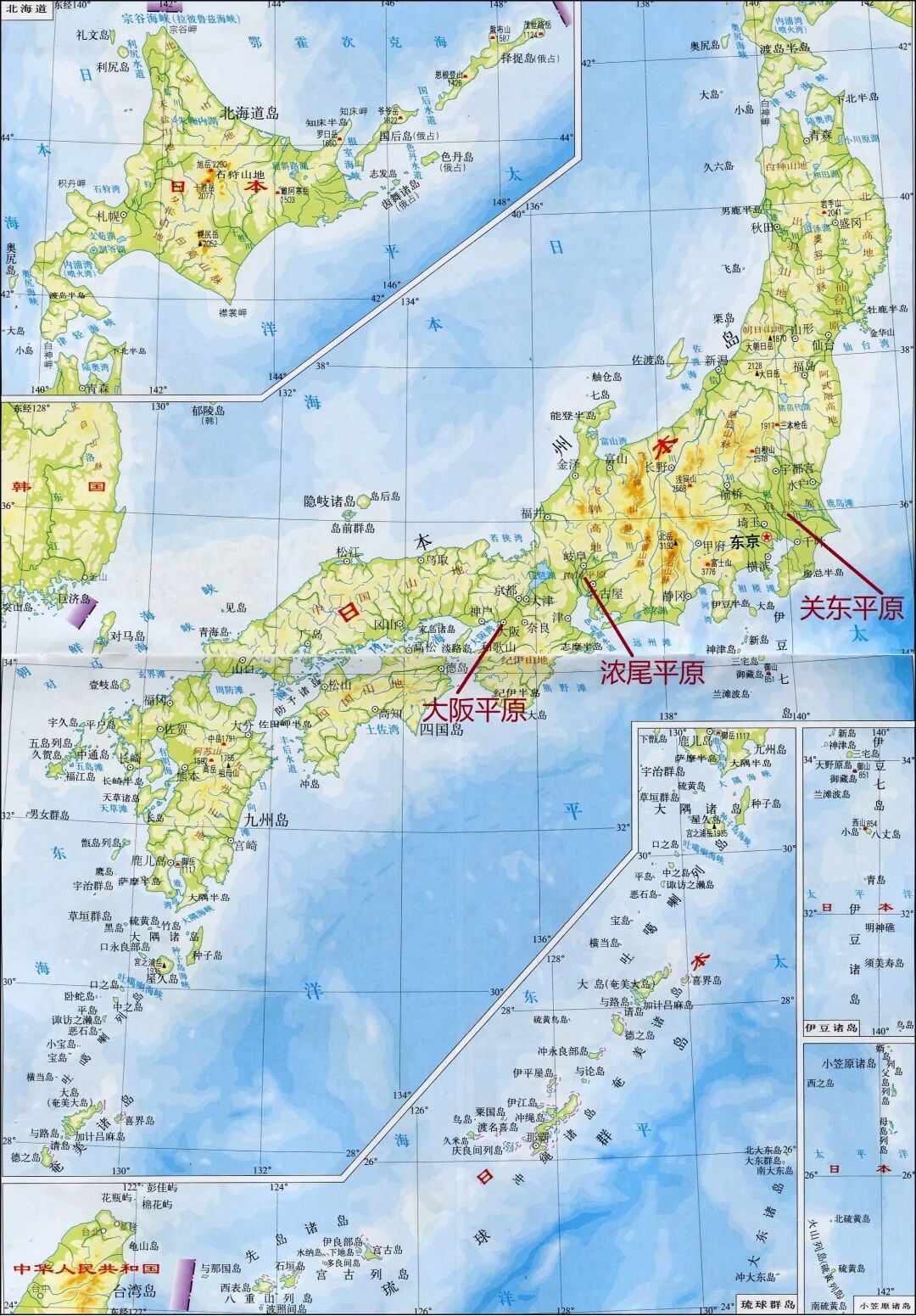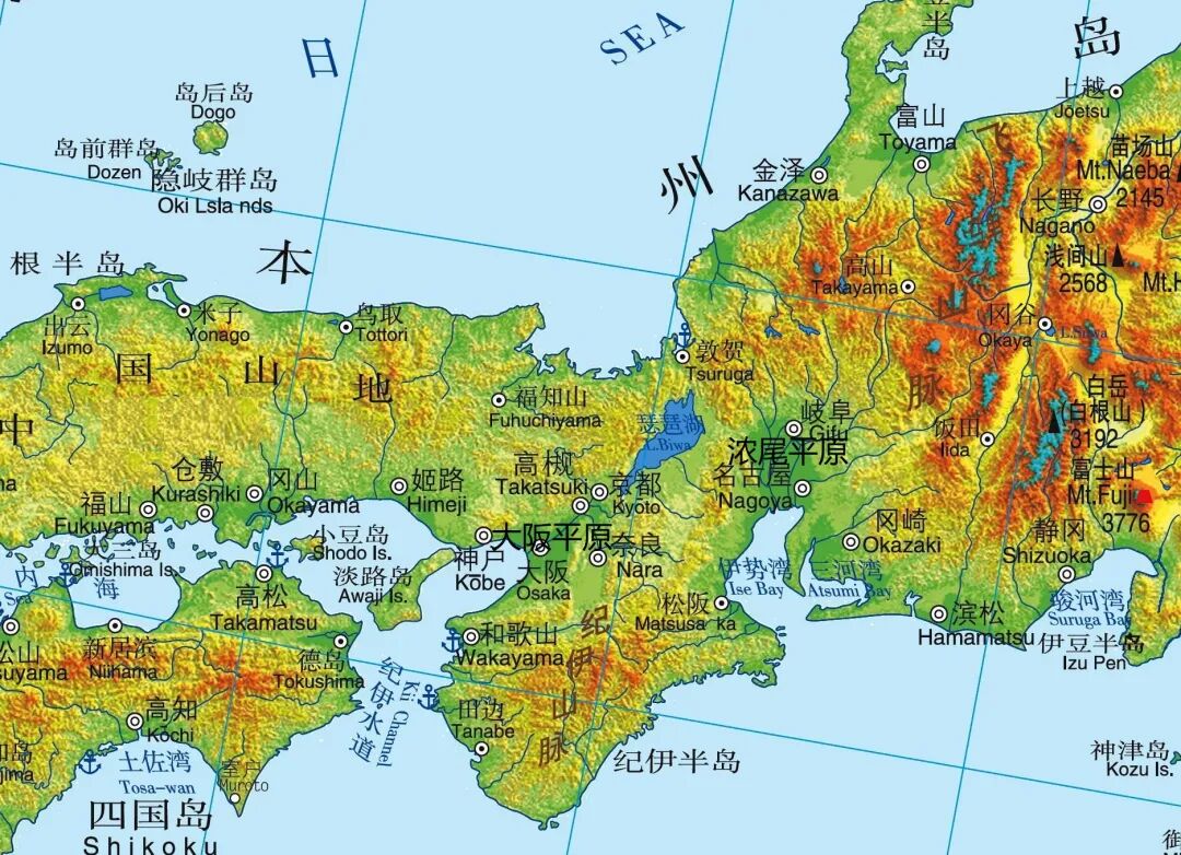 从地形角度来看,由于地壳活动剧烈,使得日本大部分岛屿都地形十分崎岖。以本州岛为例,本州岛是日本第一大岛屿,面积约为23万平方千米,也是世界第七大岛。本州岛呈东北西南走向的狭长形态,本州岛地形崎岖,以山地和丘陵地形为主,地势中部高四周低,岛屿中部的中央山脉贯穿全岛,本州岛上平原面积狭小,平原只在岛屿四周的沿海地带分布,其中关东平原、大阪平原和浓尾平原是本州岛上面积最大的三个平原。