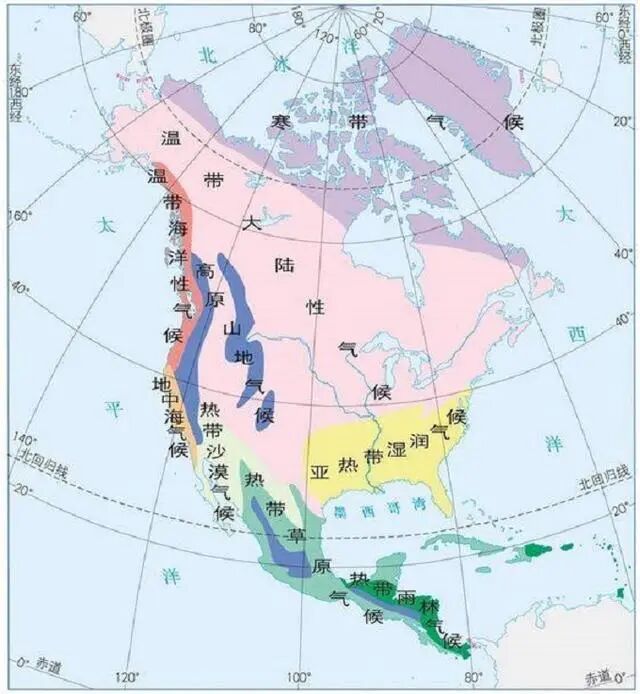 落基山脉的存在深刻的影响了北美洲的气候分布,首先在落基山脉的高海拔地区,由于海拔高形成了高山高寒气候。此外,由于落基山脉的阻挡,使得北美洲的气候分布以落基山脉为界,分为东西两部分。落基山脉的西侧至太平洋的狭窄区域,从北至南分布着温带海洋性气候、地中海气候和热带沙漠气候,这些气候类型的分布都呈狭长的条带状。由于来自太平洋的盛行西风带受到落基山脉的阻挡,抬升形成强烈的地形雨,所以这里的温度海洋性气候年降水量十分丰富。不过,当盛行西风翻越落基山脉到达东侧地区时,空气中水汽含量很少,使得这一地区的降水十分稀少,分布着干旱的温带大陆性气候。