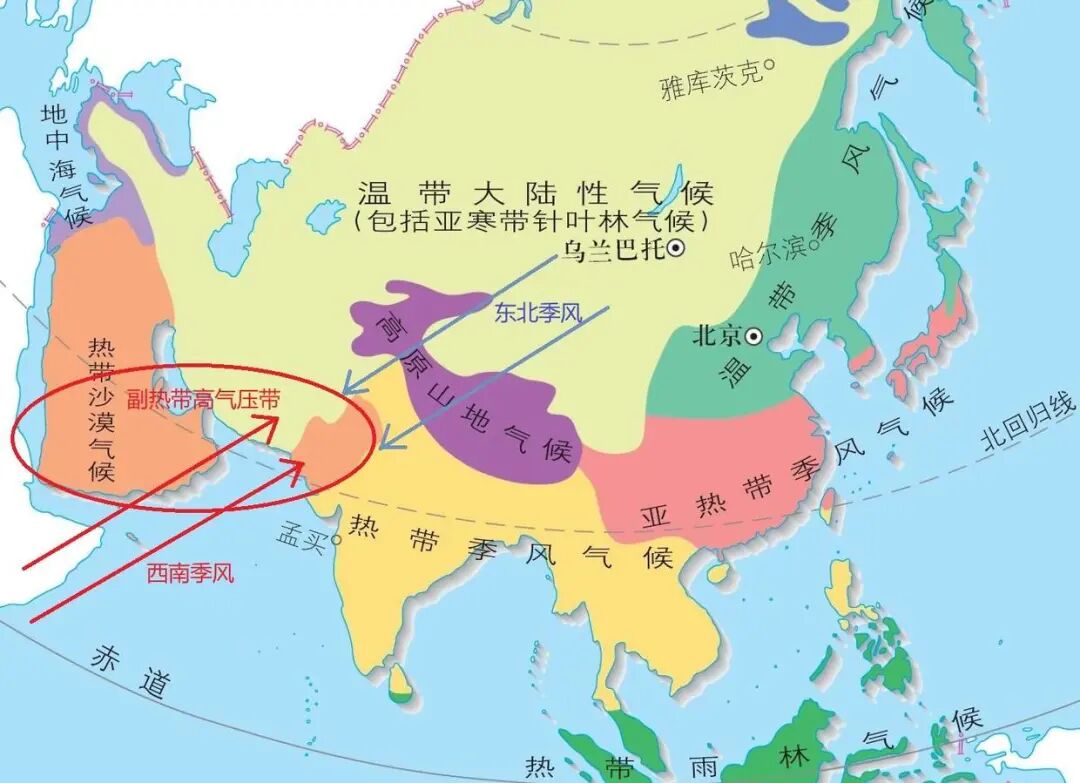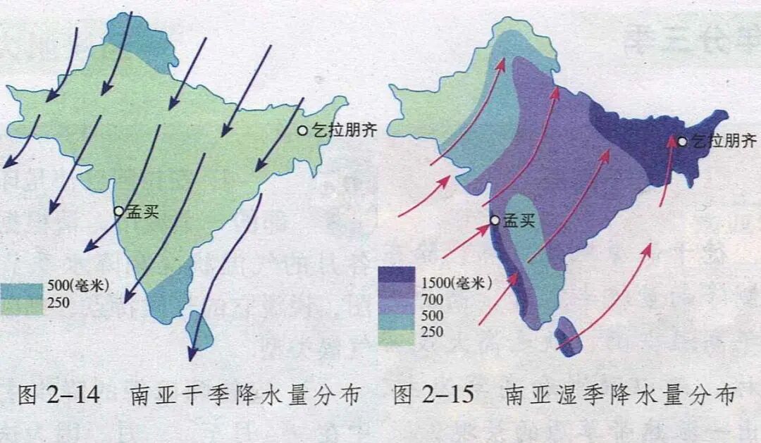 来自印度洋的西南季风在印度的东北部地区形成了丰富的降水,其中乞拉朋齐的年降水量甚至超过2万毫米,被称为“世界雨极”。那么,为什么强大的西南季风不能影响到印度河平原的塔尔沙漠呢?实际上在塔尔沙漠往东不远的地方,就有西南季风的影响,降水就开始增加,而塔尔沙漠所在地区西南季风就是影响不到,从而形成了热带沙漠气候。究其原因有两方面,一方面原因是塔尔沙漠地处北回归线附近,属于副热带高气压带控制的区域,盛行下沉气流,难以成云致雨。
