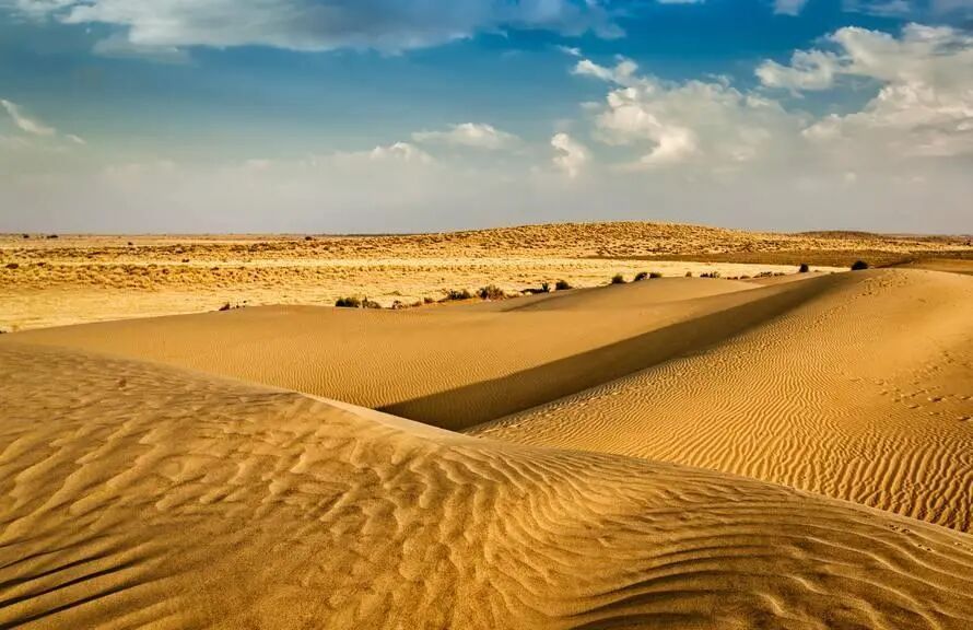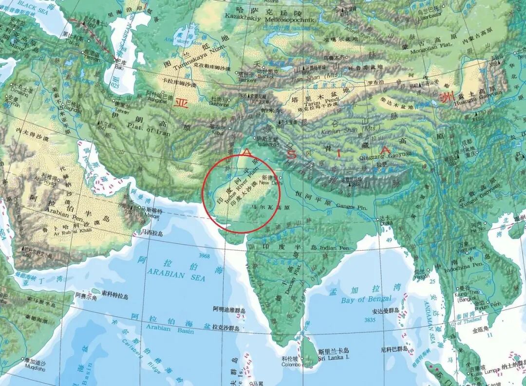 了解了沙漠的形成原因主要源于气候干旱,我们就可以来看看位于南亚印度河流域的塔尔沙漠了。印度河是南亚地区的一条大河,发源于我国的青藏高原,主要流经巴基斯坦,总体流向从东北向西南流动,注入阿拉伯海。印度河的下游地区分布着南亚地区最主要的沙漠“塔尔沙漠”,塔尔沙漠的总面积约为20万平方千米,分布在巴基斯坦和印度两个国家。很明显这里形成沙漠的主要原因就是气候十分干旱,降水稀少,但是我们知道南亚地区夏季受来自印度洋的西南季风影响,从而形成了热带季风气候。