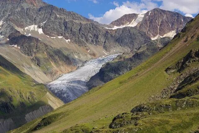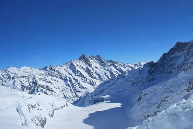 最后,是位于欧洲南部阿尔卑斯山脉中的“山岳冰川地貌”,欧洲南部地区地处亚欧板块和非洲板块的消亡边界,由于板块之间的碰撞挤压,地壳隆起从而形成了阿尔卑斯山脉,阿尔卑斯山脉是一座年轻的山脉,山脉十分高峻陡峭,平均海拔在3000米左右,其中有82座山峰的海拔在4000米以上,海拔4810米的勃朗峰是最高峰。由于,阿尔卑斯山脉海拔高,山上分布着大量的山岳冰川,由于冰川作用,在阿尔卑斯山上能够看到角峰、U型谷、冰斗等冰川地貌。角峰是指由几个冰斗所围成的山峰,因冰斗后壁不断后退,使所围山峰成为高耸尖锐的山峰。U型谷是由于冰川在向下滑动过程中侵蚀而形成的谷地,底部相对平坦开阔,呈“U”字型。
