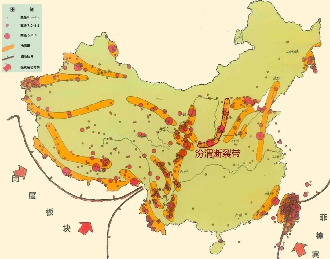 渭河平原北西南三面地势较高,东部地势相对较低,东部出函谷关(后来称潼关)后与我国的华北平原相连,渭河平原位于函谷关以西,所以又称为“关中平原”,在地形上这一地区又十分符合盆地的特征,所以又可称为“关中盆地”。渭河平原的形成是内外力共同作用的结果,从内力作用的角度来说,这一地区存在着东西走向的汾渭断裂带,岩层沿着断裂带运动,断裂带以南部分岩层相对上升,形成了地垒,也就是断块山秦岭;断裂带以北部分岩层相对下降,形成了地堑,也就是渭河平原。
