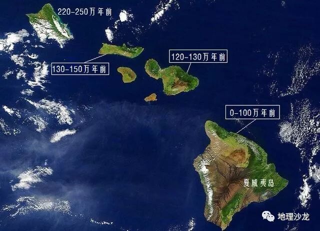 夏威夷群岛的位置,刚好处在太平洋海底地壳的断裂带上,地下的岩浆随着裂隙上升形成海底火山喷发,随着火山喷发的持续,海底火山不断增高,最终露出水面,形成岛屿。同时,夏威夷海域海底的地壳在不断地向西北方向移动,而岩浆上涌通道可理解成相对固定,这就有点像在传送带上面挤奶油一样,形成一系列的岛屿。