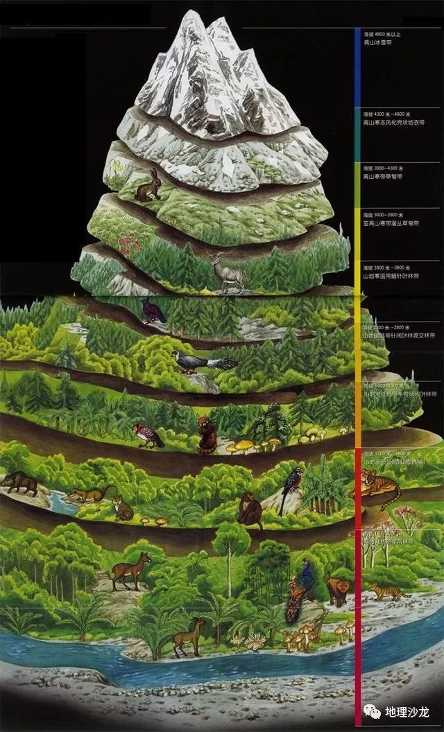 在我国,横断山脉常有“一山有四季,十里不同天”的说法,是其垂直地带性分异明显的最好写照。在云南等低纬度地区的山地部分,自然带通常会从山麓的热带季雨林、山地(亚热带)常绿阔叶林、山地(温带)落叶阔叶林、山地(亚寒带)针叶林、高山灌木、高山草甸、高山荒漠、以及永久冰川的更替,从而形成了丰富的生物多样性分布区。