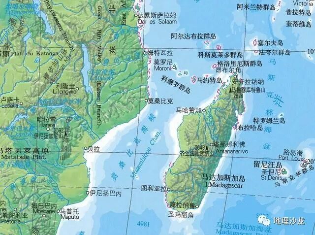 非洲除了面积最大的马达加斯加岛之外,其他大多数岛屿的面积都很小,马达加斯加岛在非洲是一个例外,因为它的面积实在是很大,面积达到了62.7万平方公里,是大不列颠岛的3倍,位居世界所有岛屿第四位(排名格陵兰岛、新几内亚岛、加里曼丹岛之后)。马达加斯加岛位于非洲大陆的东南面,个莫桑比克海峡与非洲相望,该岛原来是非洲大陆的一部分,后来由于板块运动而与非洲大陆分离,属于大陆岛。马达加斯加岛呈东北西南走向,岛上有相同走线的山脉分布,位于北部的主峰马鲁穆库特鲁山海拔2876米,为全岛最高。