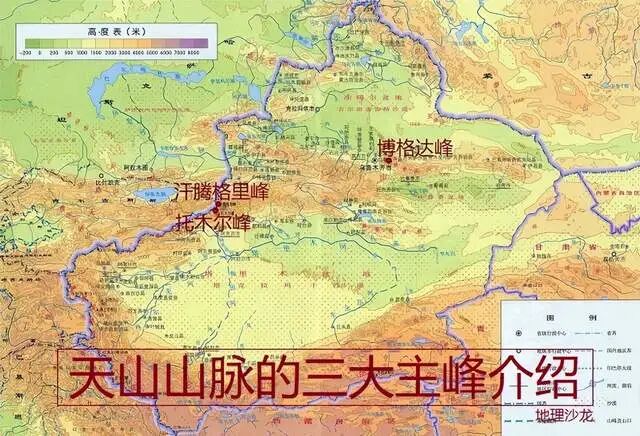 托木尔峰和汗腾格里峰都位于国境线上,而博格达峰则不同,博格达峰位于新疆维吾尔自治区阜康市境内,是天山山脉东段的最高峰,海拔5445米。博格达峰的海拔虽然6000米都不到,但是在蒙古语中博格达峰有“神山”、“圣山”、“灵山”的意思。而且,直到1998年8月4日,中国人才第一次踏上了天山山脉东段最高峰博格达峰,足见其险峻。博格达峰北邻准噶尔盆地,南隔达坂城谷地与吐鲁番盆地遥遥相望,处于荒漠包围之中,博格达峰三峰并立,成“山”字形,中峰最高。