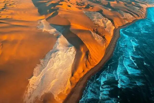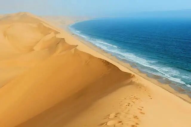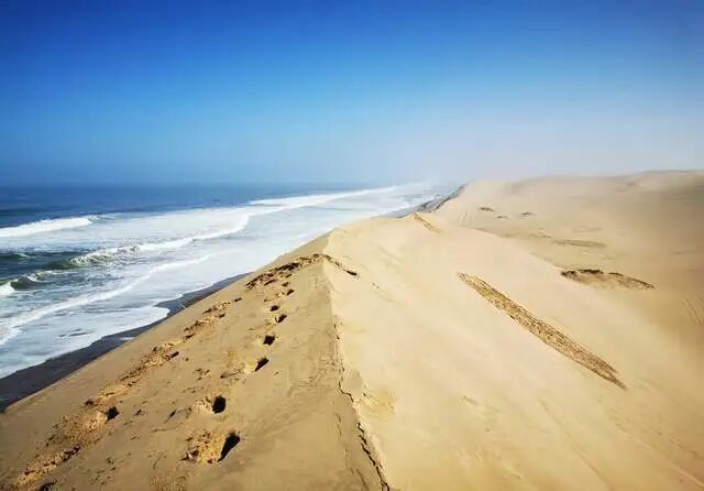 此时,另一种外力开始发挥作用,那就是海洋中的海浪,三明治湾沿岸由西向东的巨大排浪,将海洋中的沙子推向海岸,在海岸线上沉积。在风力作用和海浪作用的共同影响下,在两种力量的强力夹击下,沿岸的沙子逐渐堆积成了陡峭的沙山。这里是全球唯一一处由沙尘和海浪共同堆积形成的沙山。