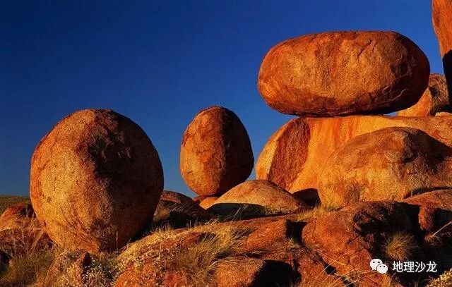 澳大利亚“魔鬼大理岩保护区”是一片长约1公里的花岗岩岩石,虽然此处名为“魔鬼大理岩”,但是岩石确实是我们之前介绍过的致密坚硬的花岗岩,这些花岗岩裸露在地表,并由表及里逐渐进行风化,岩石的棱角最先被风化剥落,逐渐产生球状风化,当然这需要漫长的时间,此处的花岗岩已经经历了数百万年的长期风化,最终形成了如此壮观的球状花岗岩堆积,像是古代神话中神鸟的巨蛋,在夕阳下格外显眼。