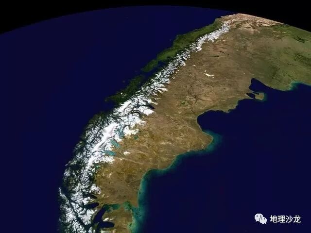 南美洲的西侧,地处美洲板块和南极洲板块(又称小板块)之间的消亡边界,板块之间相互碰撞挤压,从而形成了巨大的海岸山脉,在南美洲西侧靠近太平洋沿海形成了巨大的安第斯山脉。安第斯山脉总体的走向呈南北走向,与南美洲西部的海岸线基本平行,从南到北全长8900千米,是世界上最长的山脉,东西平均宽度达300千米,平均海拔达到了366 0米,许多高大的山顶上都终年覆盖着冰川。
