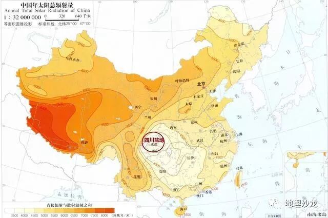 四川盆地是我国太阳辐射能最少的地区,主要原因就是由于盆地地形,盆地内的水汽,能难飘散到盆地之外,容易在盆地内聚集,从而多云雾。所以,四川盆地地区湿气较重,当地居民喜食辣椒,从而起到祛湿的作用,此外,由于太阳辐射较弱,当地女子的肤色通常十分白皙,这也是自然地理环境对于我们的影响。