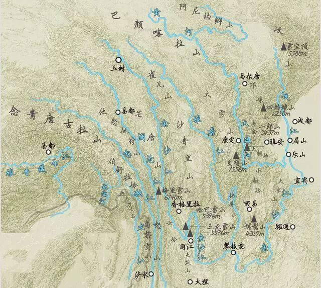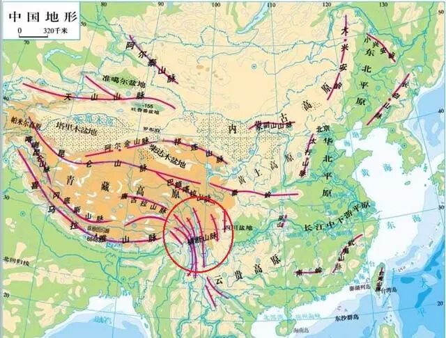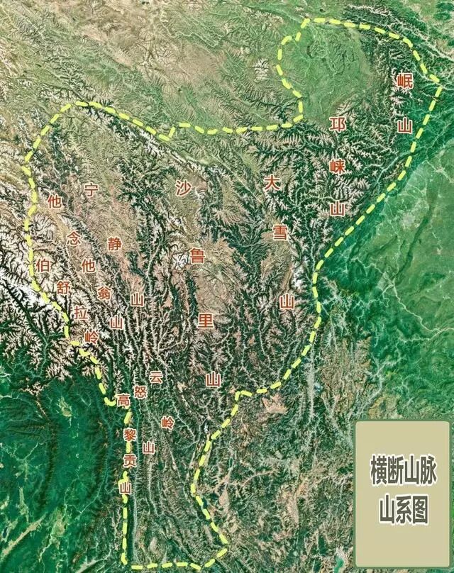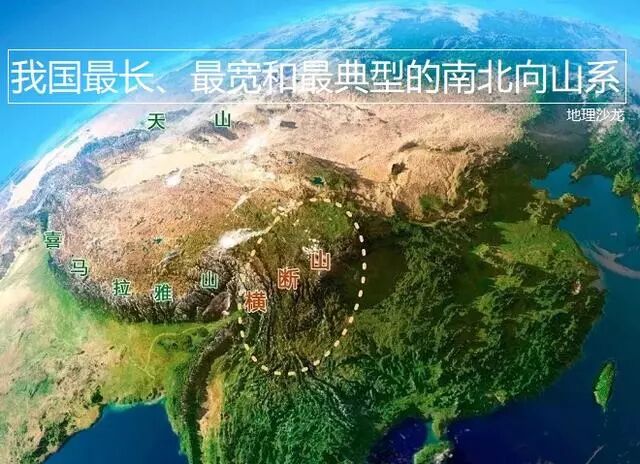 除了上述两类走向的山脉之外,我国还有南北走向的山脉,其中最主要的代表就是位于我国西南地区的横断山脉。横断山脉位于青藏高原的东部边缘,是我国第一二级阶梯的分界线,是由多列南北走向的平行状山脉组成,是我国最长、最宽和最典型的南北走向山系。