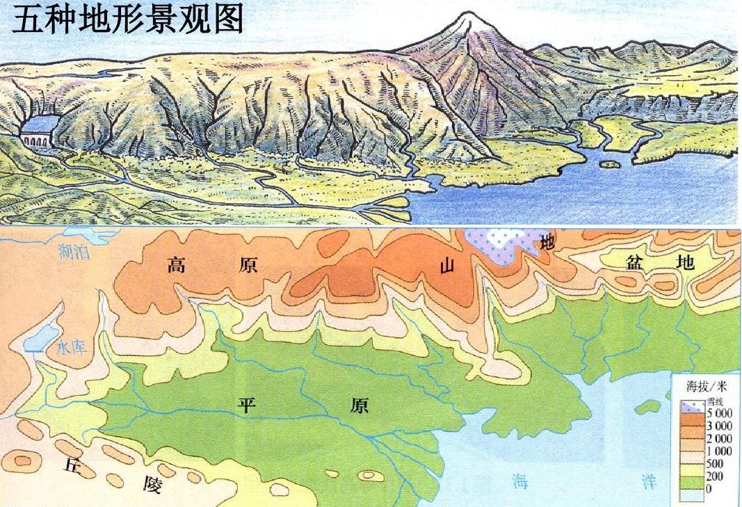 地形是指地表以上分布的固定性物体共同呈现出高低起伏的各种状态,地形可以分为陆地地形和海底地形两大类。我们人类是生活在陆地上的,所以陆地地形我们比较熟悉,陆地地形的基本分类可以分为五大类,分别是平原、高原、山地、丘陵和盆地。