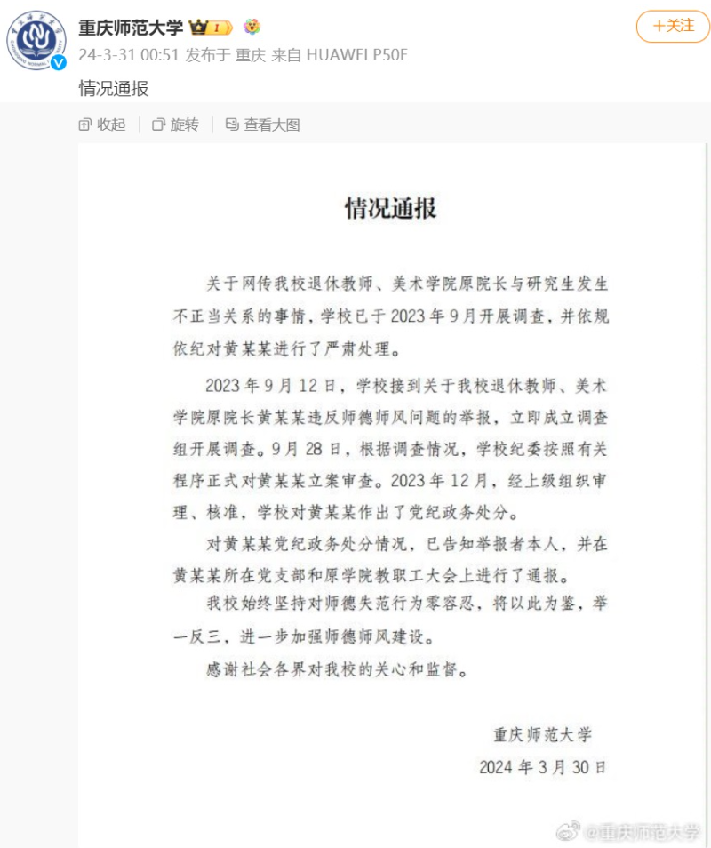 3月31日凌晨,重庆师范大学通报网传“美院原院长与研究生发生不正当关系”事件。通报指出,该校已于2023年9月开展调查,并对黄某某作出党纪政务处分。