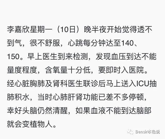 接下来情况进一步恶化,李嘉欣已经肺积水,心肺肝肾功能几乎停顿,是很紧急的程度了。