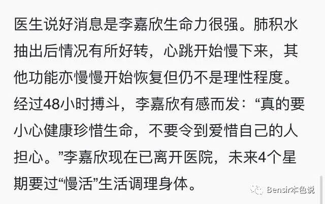 经过48小时ICU抢救,多亏李嘉欣求生意志强,肺积水抽出后情况好转,心跳逐渐恢复正常。