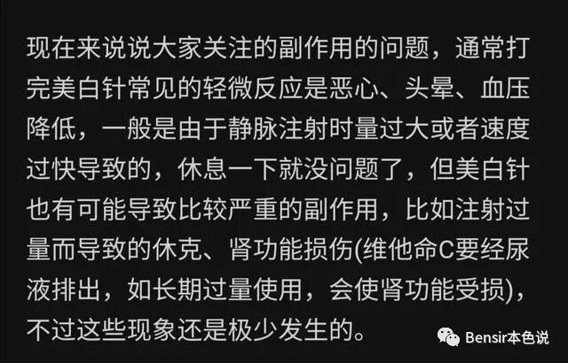 至于打美白针的副作用,大致是恶心,头晕,血压降低,肝肾功能损伤。