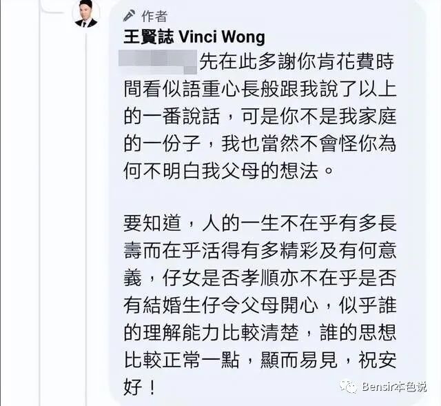 王贤志脾气很好地回复,“你不是我家庭的一份子,我不会怪你不理解我父母想法。”