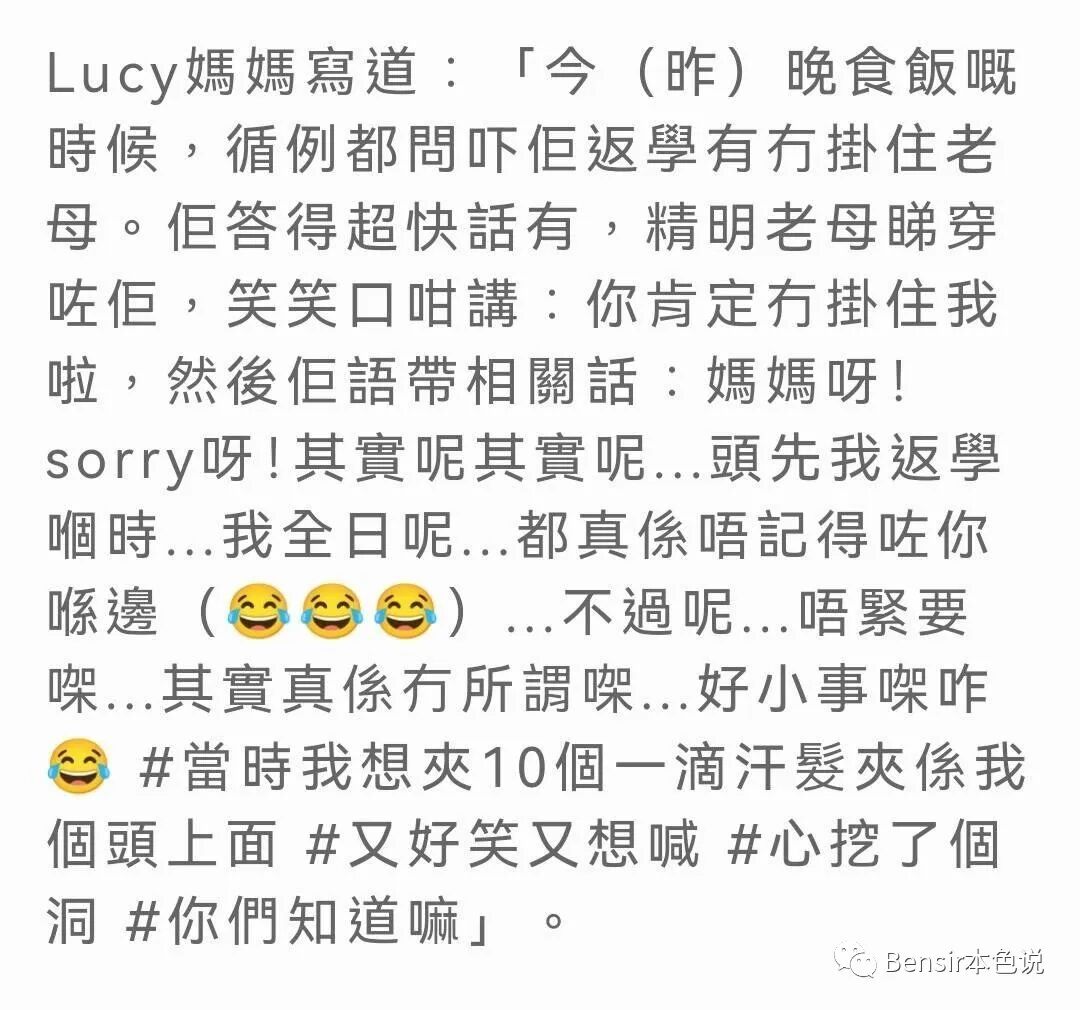 Lucy语带相关的说,妈妈呀,对不起啦,我整天都真的没想起你来,不过呢,不重要,这是小事情嘛。”