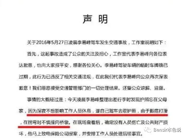 他们首先在声明里承认违反交规,向公众道歉。