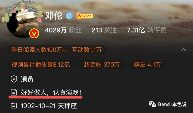 邓伦的微博简介是“好好做人,认真演戏”八个大字。