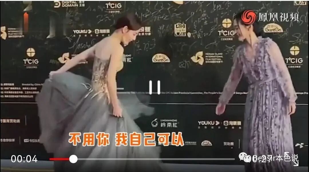 然后,摄影师要求拍几张单人照,张嘉倪提着裙摆示意何泓姗拍吧,她自己就离开了。