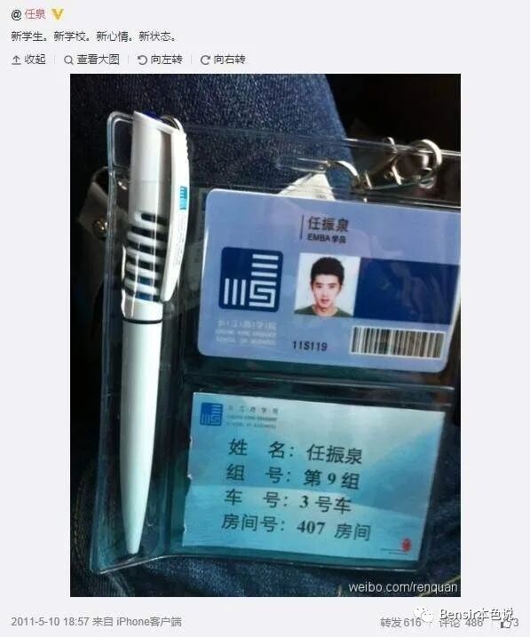 2011年,任泉在微博上晒出学生证,入学长江商学院。