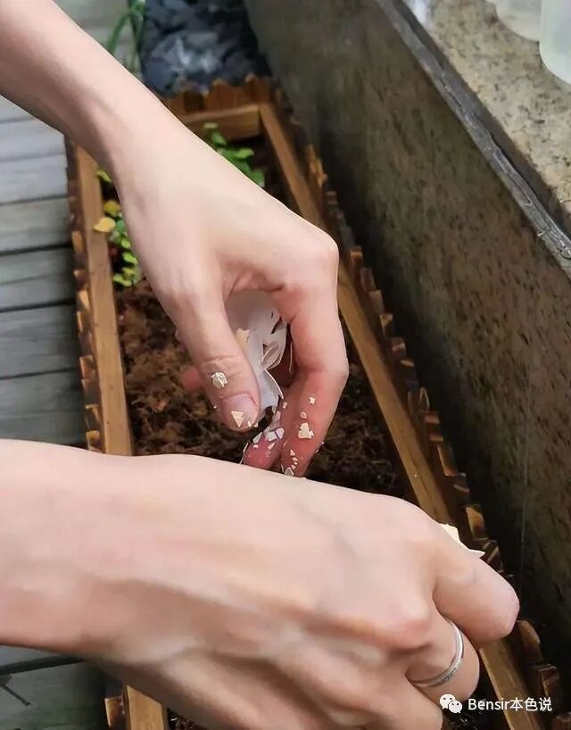 她不戴手套直接用手摆弄那些泥土,捏碎鸡蛋做肥料,各种动作非常娴熟。