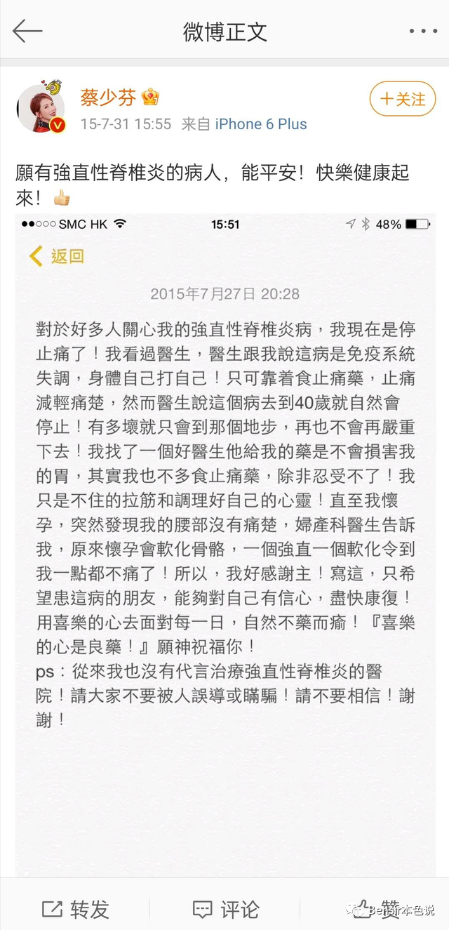 最近让李宇春刷屏的“强直性脊柱炎”蔡少芬也得过,那些年她也有过靠止疼药度日,求医无门的时候,反而是生孩子让她的病情好转。