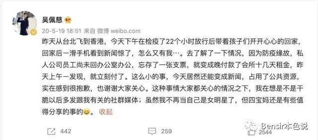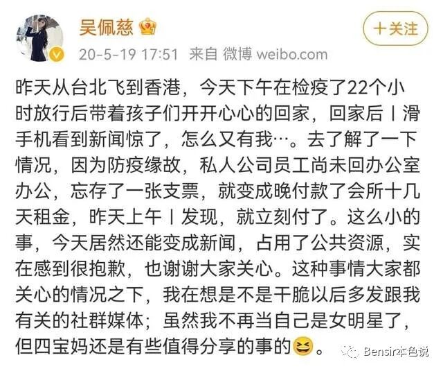 吴佩慈最后一次在微博蹦跶,是澄清一起欠债新闻。