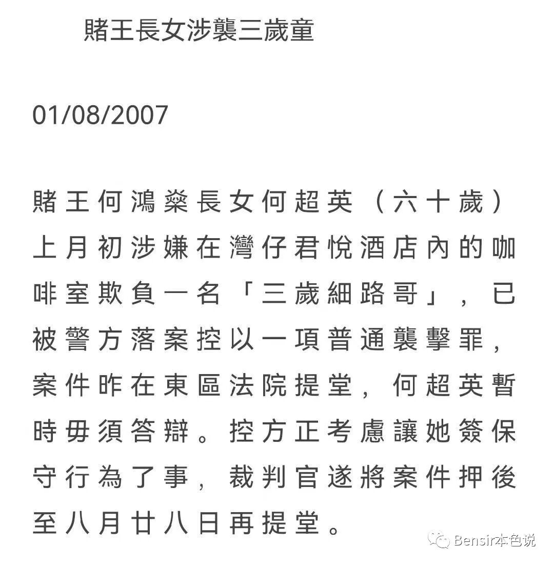 2007年,何超英在君悦酒店咖啡厅里被一个三岁小朋友撞倒,对方母亲道歉后,她突然踩踏男童左脚。