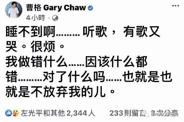 回到台湾后,吴速玲回了娘家,曹格一个人在台北。
