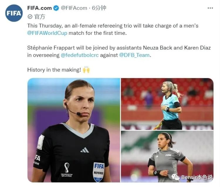 以前这个行业一直是男性垄断,这次女裁判出现在至今依旧有男女活动场所限制的卡塔尔世界杯,具有非凡的意义。