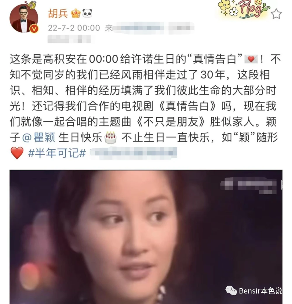 今年7月,瞿颖生日,胡兵卡点给她送上祝福,