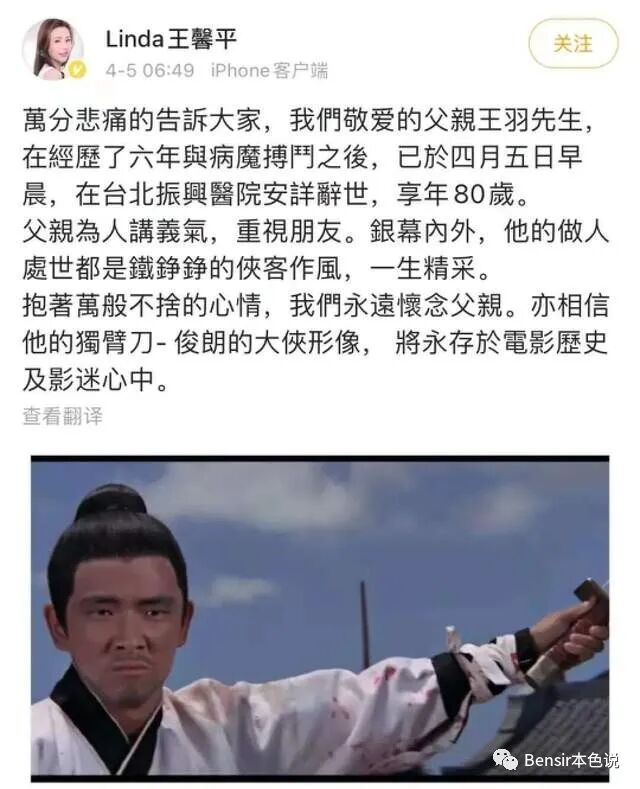 其中,王馨平正是“独臂刀大侠”王羽的女儿。