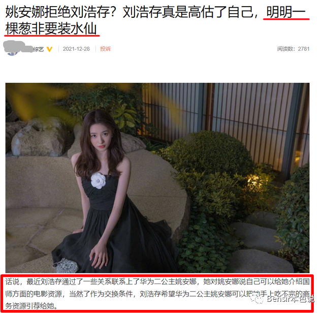 据说刘浩存团队通过了一些关系联系上了姚安娜团队,她对姚安娜说自己可以给她介绍国师方面的电影资源,作为交换条件,刘浩存希望姚安娜可以把她手上吃不完的商务资源引荐给她。