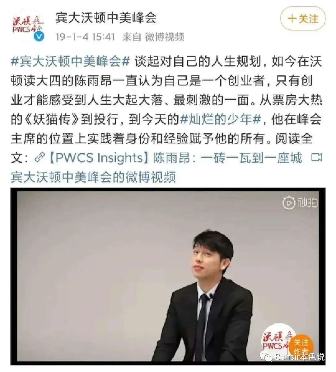 2019年陈雨昂还参加了宾夕法尼亚大学沃顿商学院中美峰会,视频中他对着镜头侃侃而谈,颇有几分父亲的风采。