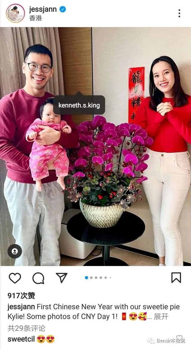 另一位豪门新秀湛琪清的照片也发得很勤。先是率老公抱着女儿来一张。