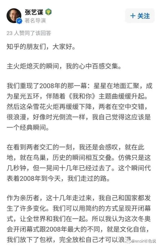 演出完成后,张艺谋罕见地登上社交软件,洋洋洒洒写下了自己的冬奥会感言: