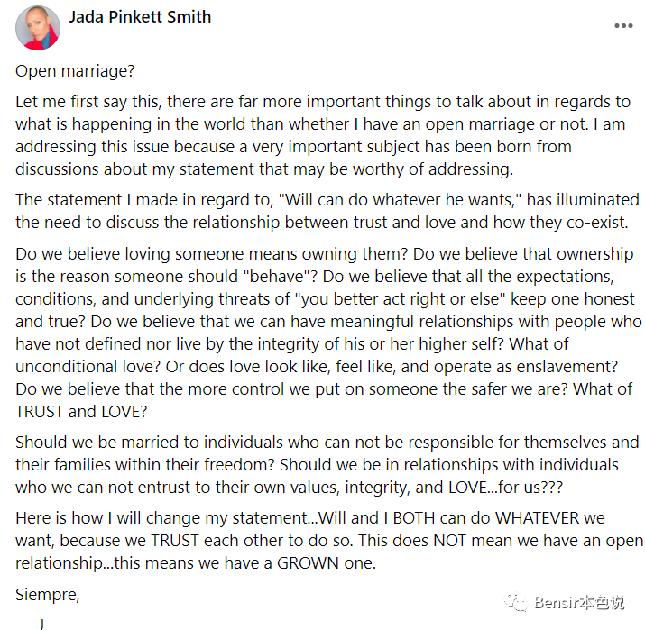之后,她又在社交媒体上进一步阐述和澄清与威尔·史密斯的婚姻形态,