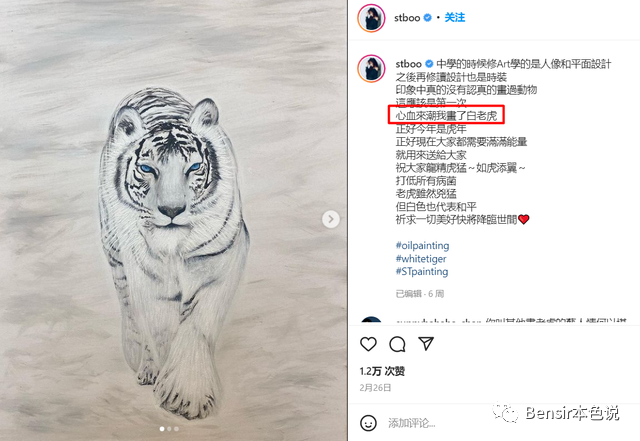 不过邓丽欣的画工倒是极好,她在IG上晒出一幅白老虎油画,看起来栩栩如生,非常传神。