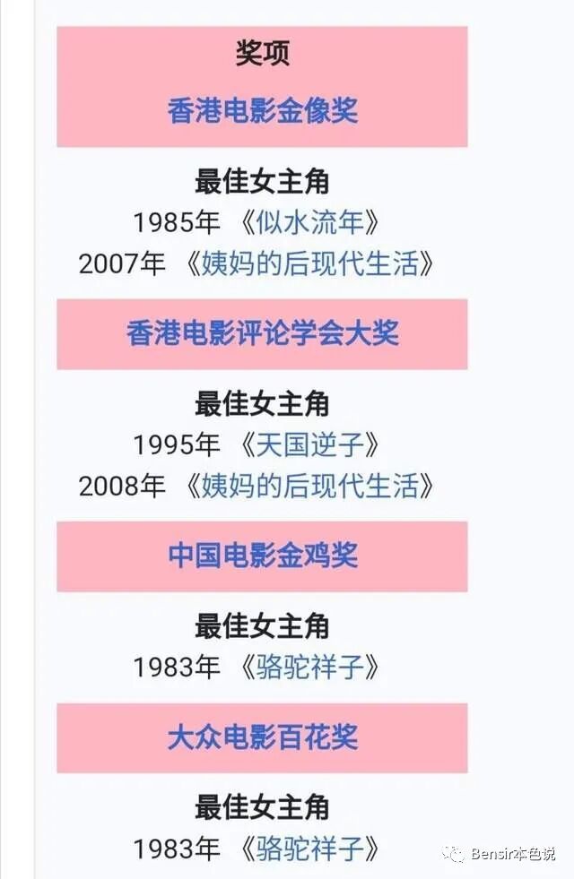百度百科里,斯琴高娃老师获得过金鸡奖,百花奖,金像奖,金熊奖,芝加哥电影节奖等中外大小奖项十余座。