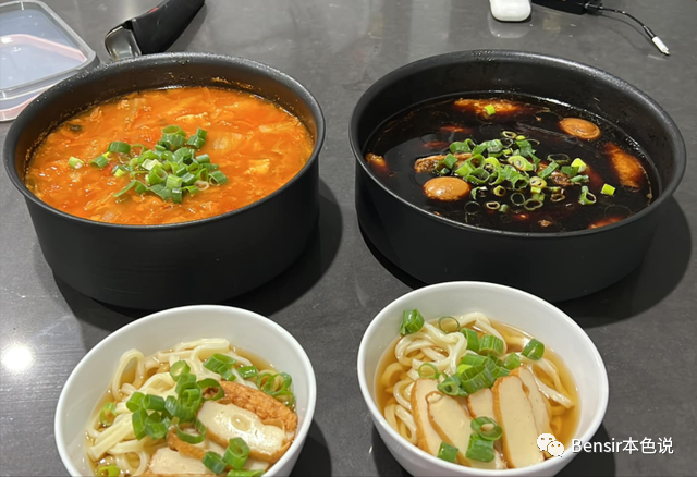 母女俩吃得非常简单,两个小小碗的拉面,一碗酱汤,一点卤味,看上去很可口的样子。