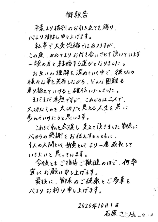 但宣布嫁给他的那一天,石原里美发表了一封长信,信中写道: