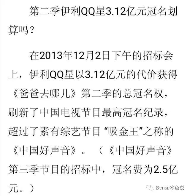 会前,传闻最低报价是2.52亿,最终,伊利QQ星砸下3.1199亿,拍下《爸爸去哪儿》第二季冠名权。